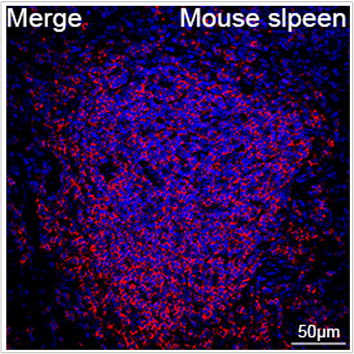 ![]() | Confocal imaging of paraffin-embedded Mouse spleen tissue using ABflo® 647 Rabbit anti-Mouse CD22 mAb (A24628, dilution 1:100) (Red). DAPI was used for nuclear staining (Blue). High pressure antigen retrieval performed with 0.01M Citrate Buffer(pH 6.0) prior to IF staining. Objective: 40x. |