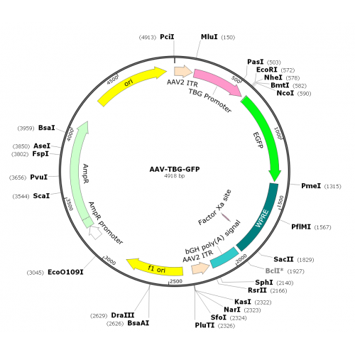 | Description: | AAV8-TBG-GFP is a pre-packaged rAAV in serotype 8 (capsid from AAV serotype 8 and 2xITR from AAV serotype 2) which over-expresses EGFP under the liver specific TBG promoter. TBG promoter is a hybrid promoter based on the human thyroid hormone-binding globulin (TBG) promoter and microglobin/bikunin enhancer; The TBG promoter is about 0.8 kb in length and has been used for liver-specific transgene expression. |